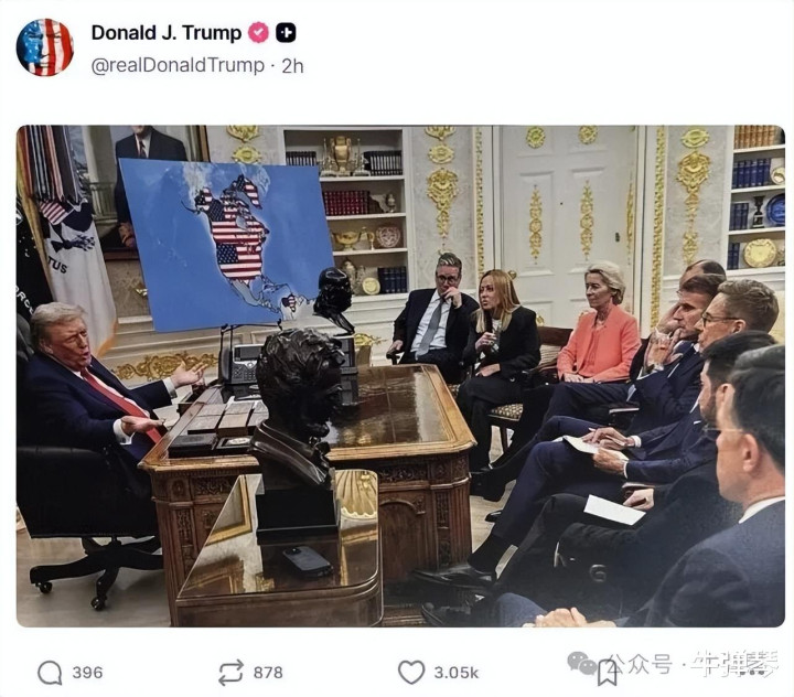 另一张,底片应该是去年8月,他在白宫见欧洲领导人,但原来背景板上的乌克兰地图,P成了美洲地图,仔细一看,好家伙,星条旗不仅覆盖了美国,还覆盖了加拿大、格陵兰岛和委内瑞拉。