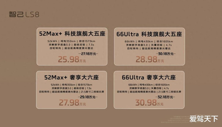 智己LS8全系搭载1.5T增程能源,提供单电机后驱和双电机四驱两种,并基于800V平台打造。其中,后驱版纯电续航可达355km,抽象续航为1573km;四驱版纯电续航430km,抽象续航为1605km。