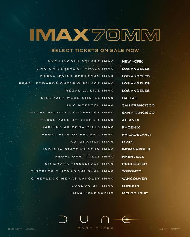 上周,华纳昆玉一忽儿放出了《沙丘3》70mm胶片IMAX影厅的首批预售票,尽管距离影片在北好意思上映(12月18日)还有8个月的时候。