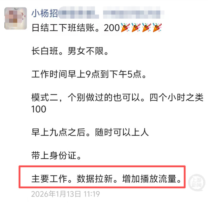 2026岁首,根据掌执的萍踪,上游新闻记者找到了江苏泰州的别称杨姓中介,其打法平台知道,他永远招聘日结工,男女不限,工资日结200元,需带身份证。主要处事是数据拉新、加多播放流量。