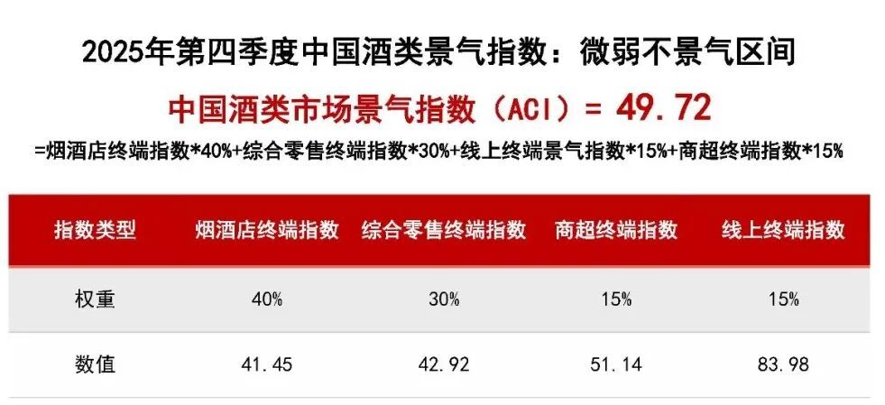 中国酒类剖判协会和会策动者主不雅判断与客不雅销售数据,摄取合成指数法编制的中国酒类市集景气指数(ACI)泄露,2025年第四季度,烟旅店结尾景气指数为41.45,仍处于“较不景气”区间;而线上结尾景气指数高达83.98,处于“十分景气”区间,发达极为亮眼。中国酒类剖判协会副会长、盛初揣摸董事长柴俊基于景气指数谈判数据的解读是,现时酒类市集的调整并非不详的周期性波动,而是进入了“淘汰赛”,零卖结尾在加快出清。