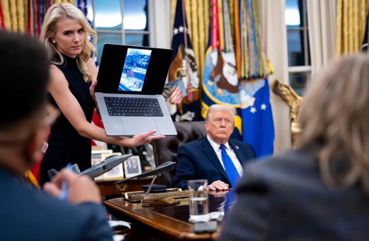 1月7日,美国总统助手向特朗普及现场记者播放视频。图源:环球网援引美媒