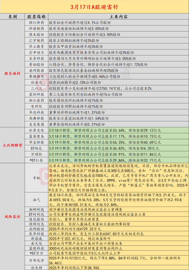 导读:财联社3月17日投资避雷针,近日A股及外洋商场潜在风险事件如下。国内经济信息方面包括:1)老本与需求双重挤压,3月手机面板价钱延续跌势;2)多家手机厂商文牍调价,部分机型价钱高潮近千元;公司方面重心护理包括:1)湘邮科技因涉嫌信息泄漏违警违纪被证监会立案窥察;2)速达股份实控东说念主、董事长李锡元被留置;外洋商场重心护理包括:1)特朗普泄漏遑急哈尔克岛石油智力;2)国际油价16日大幅下落。