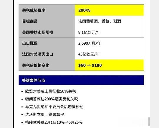 特朗普选择葡萄酒这一法国最具象征意义的产业开刀,显然意在"杀鸡儆猴",向其他欧洲国家传递明确信号:谁反对美国,谁就将付出经济代价。
