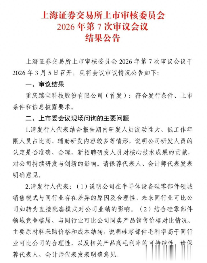 2026年3月5日,上交所官网表露,重庆臻宝科技股份有限公司(简称“臻宝科技”)科创板IPO表情取得上市委会议通过。