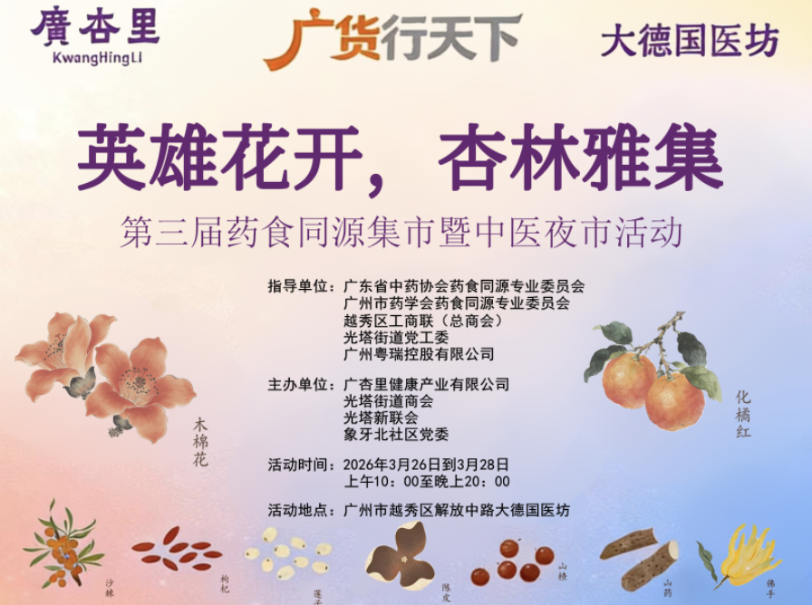 3月26日至28日,2026广州“好汉花开好汉城”系列行径之第三届药食同源集市暨中医夜市在历史文化底蕴深厚的大德国医坊精彩开市。行径由广东省中药协会药食同源专委会、广州市药学会药食同源群众委员会、越秀区工商联(总商会)、光塔街谈党工委斥地,光塔街谈商会、广杏里健康产业有限公司、象牙北社区党委等主持。