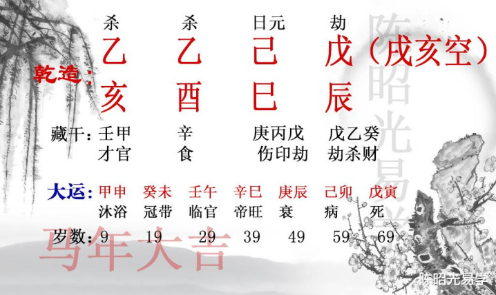 乾造:乙亥,乙酉,己巳,戊辰(戌亥空)