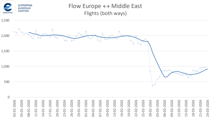 欧洲航空安全组织(Eurocontrol)发布的《欧洲航空趋势》论说炫耀,自3月5日起,中东地区干系航路航班量有所回升,逐日双向约800班,较此前减少约1200班,降幅为59%。