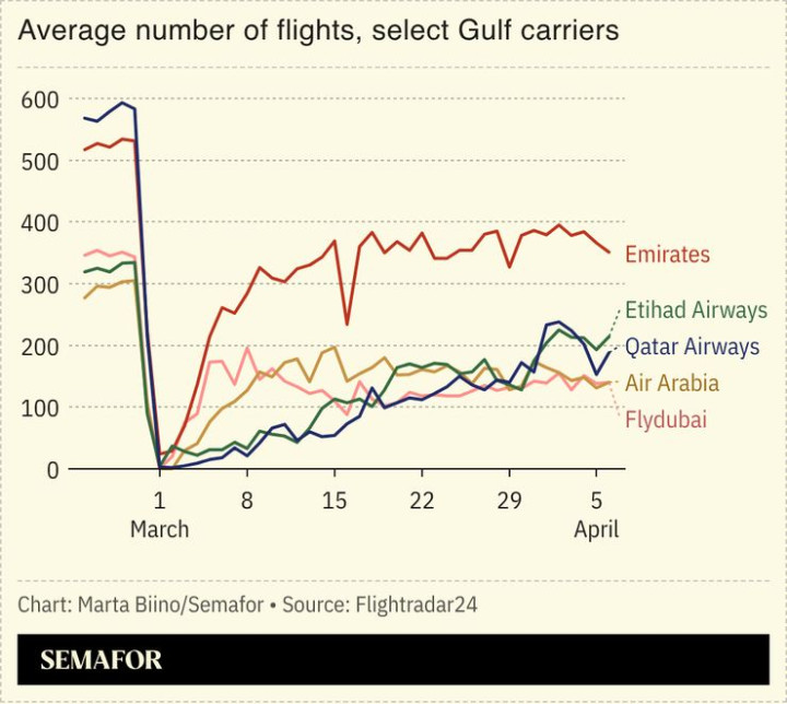 Flightrader24的数据炫耀,海湾地区主要航空公司的航班量3月1日出现断崖式下降,近乎全面停摆;尔后虽缓缓回应,但戒指4月初,通盘航司均未回到冲突前水平。日常情况下,迪拜、多哈、阿布扎比这三大机场逐日总共措置跳跃3000架次航班。