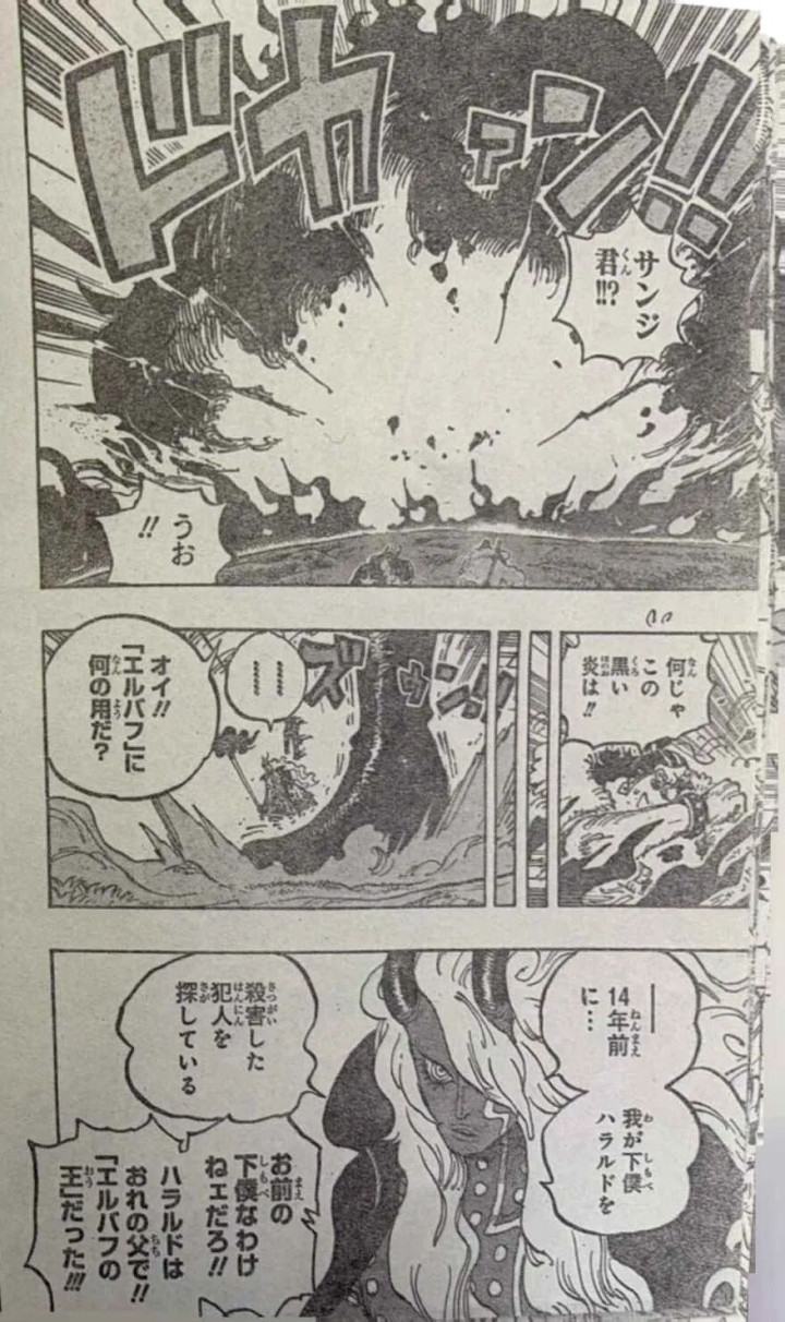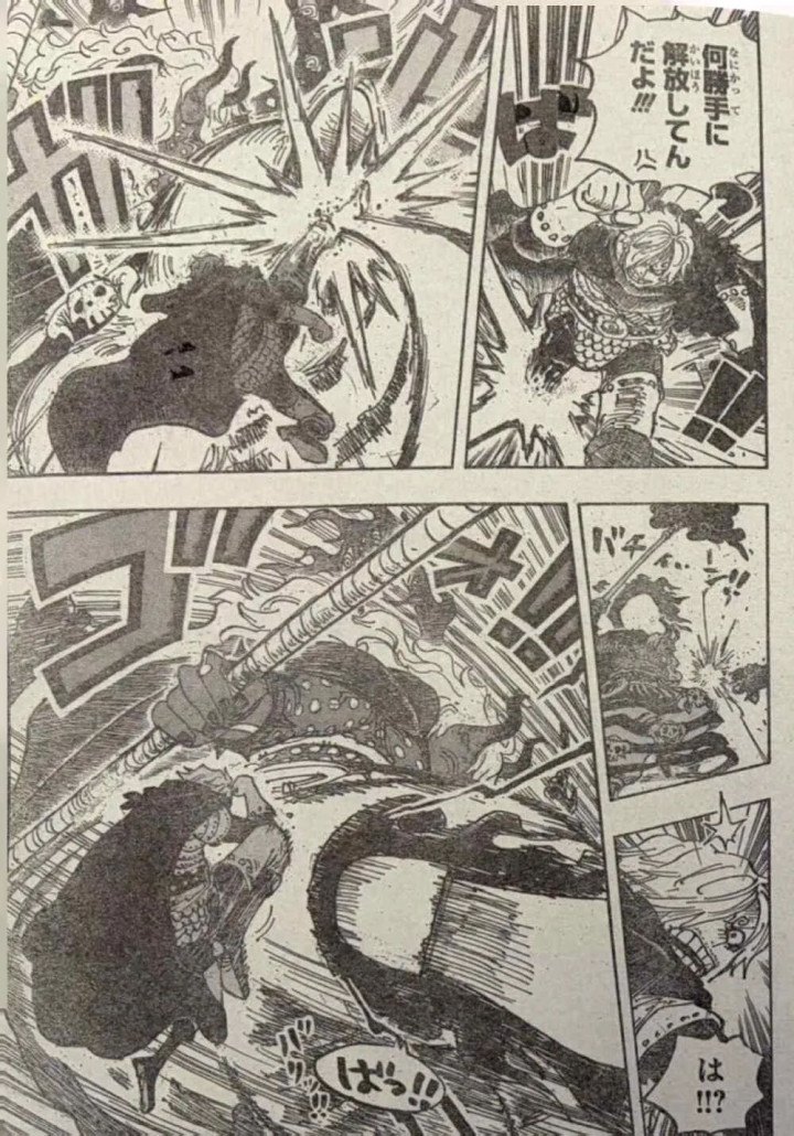 山治很不悦,他用脚向伊姆踢去,伊姆也用脚底挡下了山治的这一击。随后,伊姆用缠绕着黑焰的踢技回敬山治,山治连忙抵触这一击。