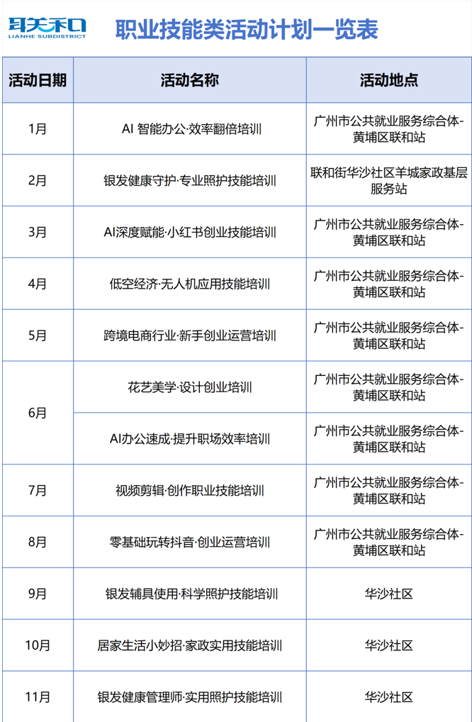 事业手段类12场:在AI办公、短视频运营基础上,新增银发照护、跨境电商等热点培训,实用易学,助力手段擢升、增收赋能。