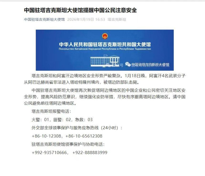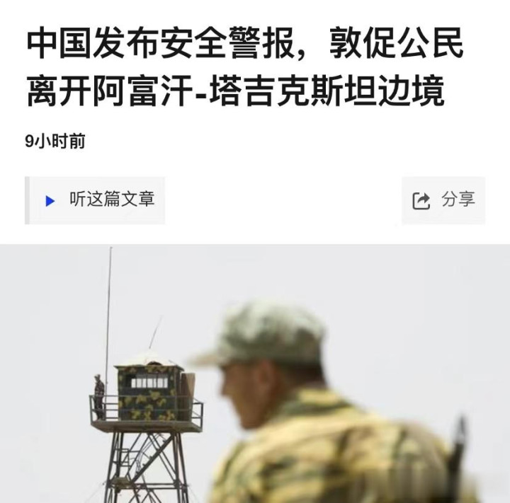 另外,中国驻塔吉克斯坦大使馆同一天也发出提醒,说阿富汗和塔吉克边境沿线的安全形势“极其严峻复杂”。由此敦促中国公民尽快离开边境地区。