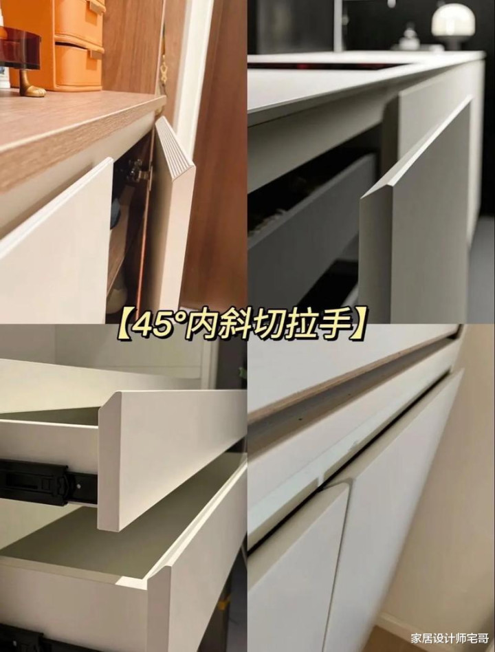 我当今的作念法是:门板下挂5毫米,手径直从底下扣开,或者作念45度斜切拉手,既莫得隆起,又无谓弹簧件。
