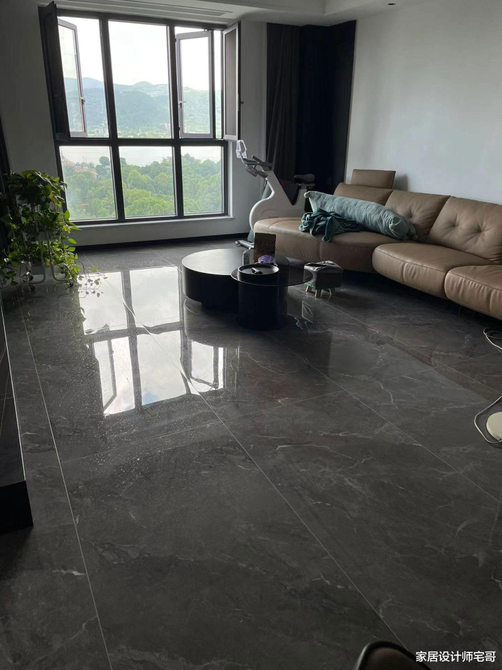其后他把客厅的地砖换成了柔光砖(光泽度15-25度),雷同深灰色,不显灰、不反光、拖地没水痕。