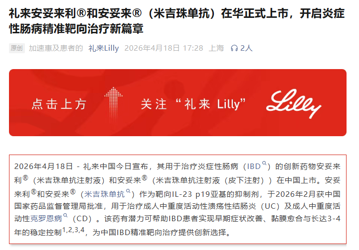 每经AI快讯,4月18日,礼来中国晓谕,米兰app官网版其用于治愈炎症性肠病(IBD)的改换药物适应来利®(米吉珠单抗打针液)和适应来®(米吉珠单抗打针液(皮下打针))在中国上市。适应来利®和适应来®(米吉珠单抗)当作靶向IL-23p19亚基的阻挡剂,于2026年2月获中国国度药品监督管制局批准,用于治愈成东谈主中重度举止性溃疡性结肠炎(UC)及成东谈主中重度举止性克罗恩病(CD)。